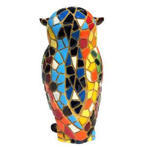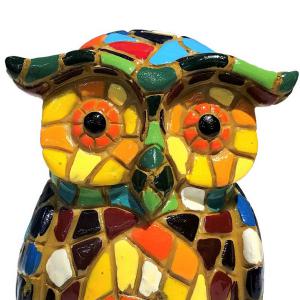 Chouette en résine, entièrement peinte à la main suivant la technique espagnole du Trencadis.